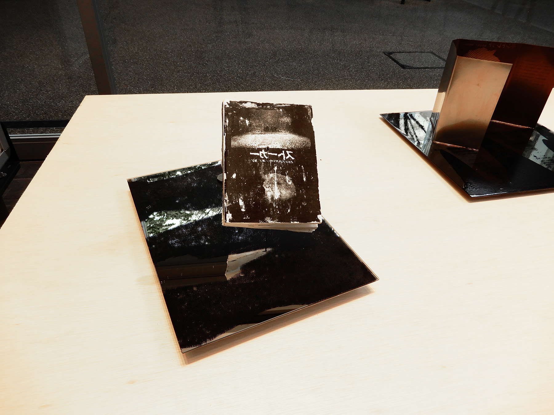 SFのブックイベントに併せて、SFの本をモチーフとした立体作品を展示した。文庫本の表紙を、写真製版用のアルミ樹脂版に製版した版のシリーズと、石膏で型取りした本の立体の表面に、本のカバーの白黒コピーのトナーインクを転写した作品シリーズは共に、表面の像、形態ともに、本を反転させた形を取っています。本という複製メディアの経験のオリジナリティとそこにおけるフィクショナルな時空間を、転写・反転させることで実際の時空間へ再構成した作品を、この作品にとってのオリジナルである本の中に置いてみたいと思いました。