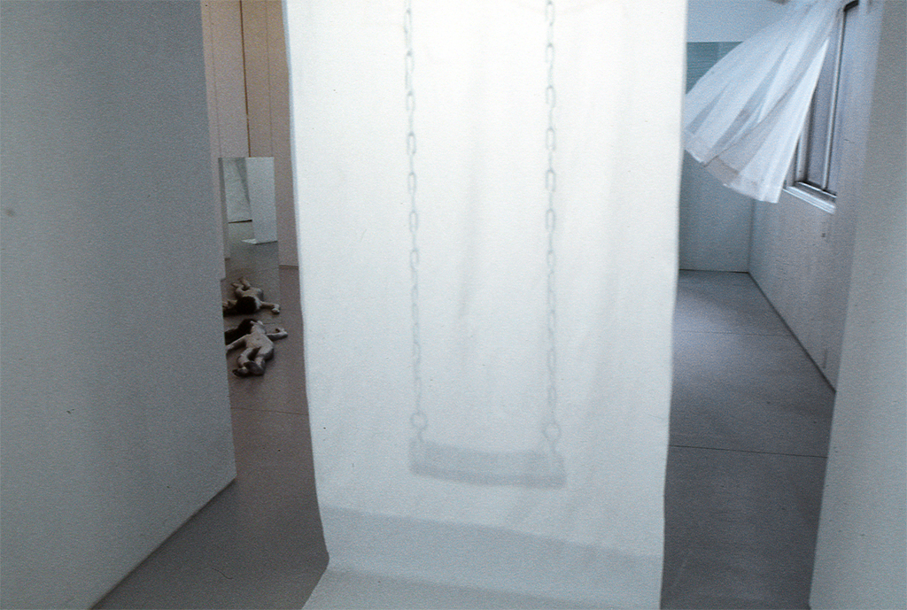 Mixed media: Paper, Xerox copy, curtain, plexglass, OHP projector, fabric, double sided mirror